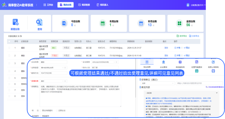采用卡片分类与列表视图双模式展示台账数据,按企业信息、业务类型、受理状态等字段灵活查询登记信息,支持经办人员快速定位业务进展。