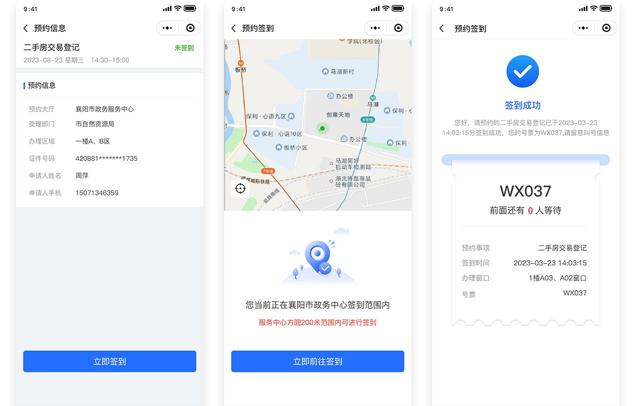 预约用户前往政务服务大厅后借助预约小程序进行线上签到,系统会结合预约事项、时间、定位数据进行多重核对后完成线上签到,并输出号票信息,同时将数据流转至排队叫号&业务系统,进行后续业务办理服务。